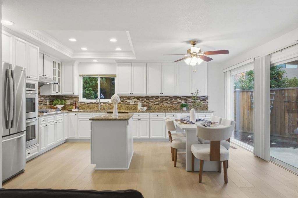 Welcome to 3474 Hudson Place, a comfortable, single-story home tucked at the end of a peaceful cul-de-sac in Fremont's well-loved Brookvale neighborhood. With approx. 1,688 sf of living space on a generous lot, this 3-bedroom, 2-bath home offers a practical layout with good flow between the living, dining, and kitchen areas - great for family life, hosting guests, or everyday routines. The kitchen is tastefully updated with a gas cook-top, stainless refrigerator, top of the line cabinetry, extra storage and an island for extra prep. space. The kitchen opens to the dining area, which has a sliding glass door to the backyard. The back and side yards feature mature roses bushes, fruit trees and a covered patio, giving you room for outdoor gatherings, a play area, or even a future vegetable garden. The attached garage adds secure parking and extra storage. Families will appreciate being close to some of Fremont's top schoolsBrookvale Elementary, Thornton Middle, and American High. The location also offers easy access to shopping, parks, and major commute routes like I-880 and BART, making daily travel simple and convenient. If you've been looking for a well-located Fremont home in a quiet neighborhood with strong schools and a welcoming community, this is a wonderful opportunity!