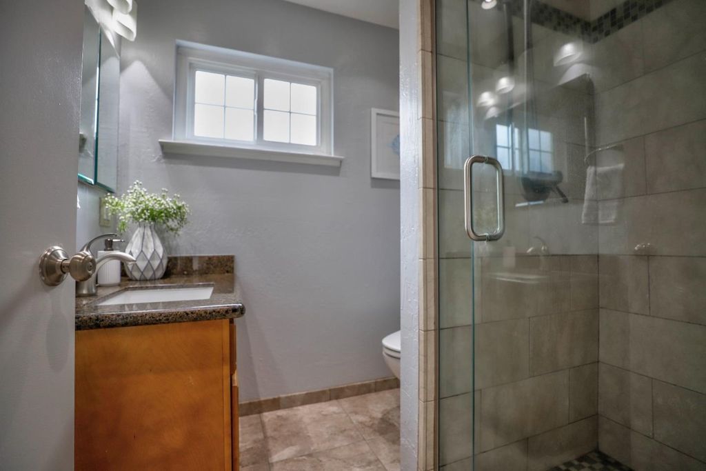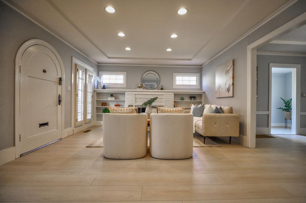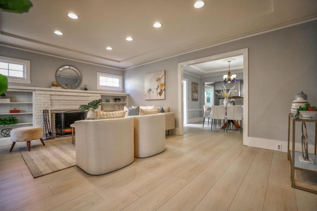 Experience the charm of this beautifully updated 1925 bungalow with Spanish influences, ideally located on a tree-lined street in the desirable Garden Alameda neighborhood. The spacious, light-filled living room features floor-to-ceiling windows with plantation shutters, crown molding, recessed lighting, a classic, inviting fireplace with a new tiled hearth, and built-in bookshelves. The formal dining room with a breakfast bar opens to the updated kitchen. An enclosed side porch is perfect for a home office or exercise room. Two front bedrooms share a tastefully updated bathroom with a heated tile floor. New SPC flooring runs throughout the home. The kitchen boasts solid granite countertops, white cabinetry, a large pantry, and direct access to the large deck and backyard. A convenient laundry room offers built-in linen shelving. The primary bedroom features sliding doors to the rear deck and a remodeled en-suite bathroom with tile flooring. Recent upgrades include a newer water heater, furnace, air conditioning system, and a 7-year-old roof. A fully owned solar system provides significant energy savings. Unbeatable location blocks from Alameda's popular restaurants, Caltrain station, SAP Center, Whole Foods, and more. Open House Sat & Sun.
