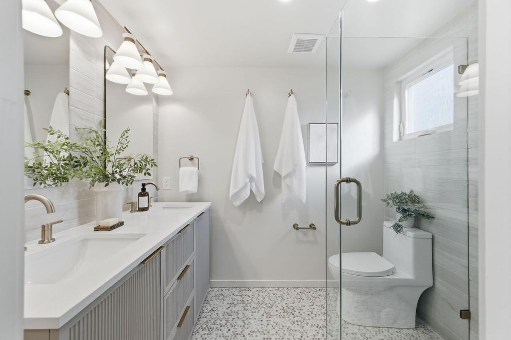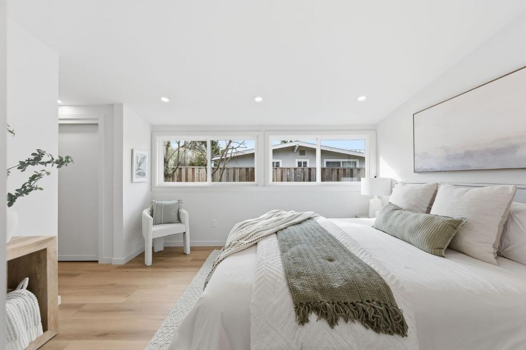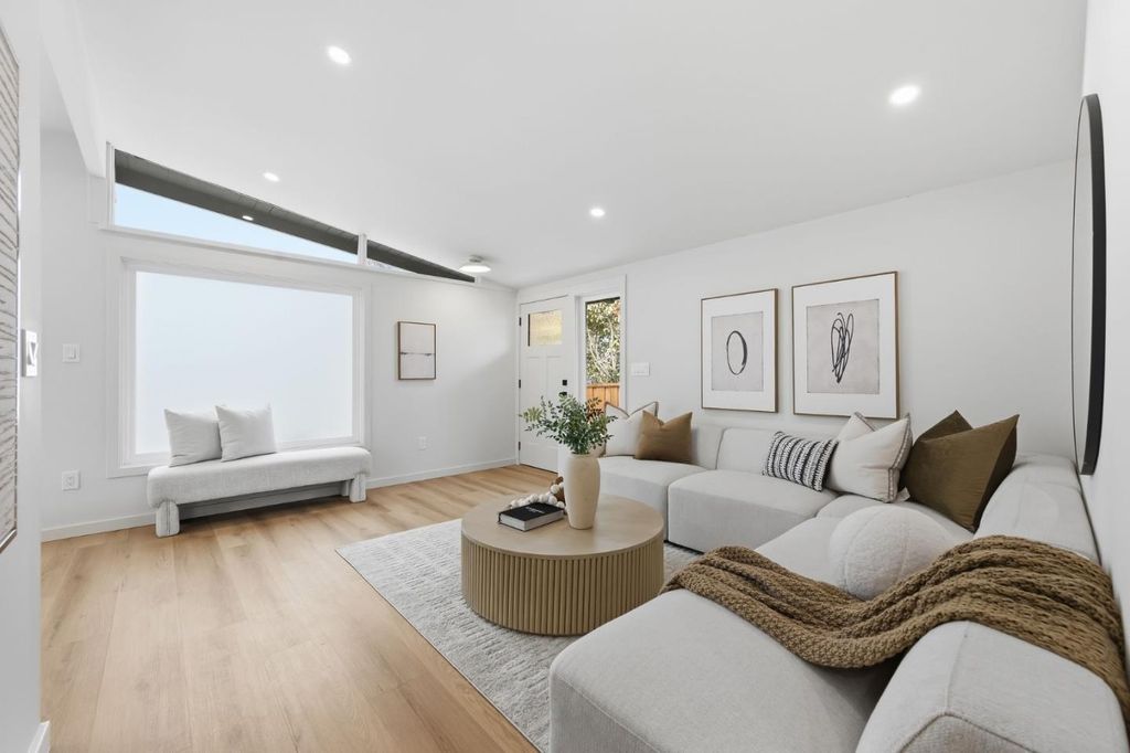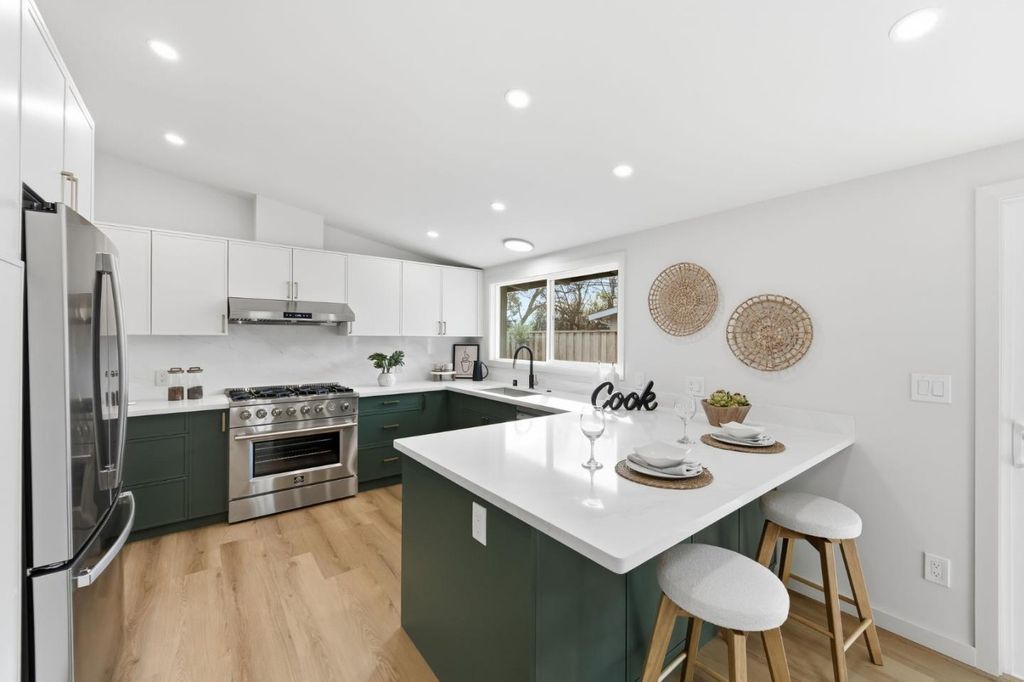 Located in Sunnyvales sought-after Lakewood Village, 1245 Manzano Way is a beautifully renovated, mid-century modern home merging iconic design with sleek sophistication. The olive grey exterior and bold orange entry make a striking first impression. Discover an open-concept layout featuring vaulted ceilings, a large picture window, and glass sliders that brighten the home with natural light. Fresh exterior and interior paint, new flooring, and recessed lighting create a warm, inviting atmosphere. The stunning chefs kitchen offers a 6-burner stainless steel range, cabinetry with champagne bronze hardware, quartz counters, and a peninsula bar for casual dining. 3 comfortable bedrooms with 2 renovated bathrooms include a generous primary suite with dual closets and a serene bathroom oasis. Enjoy the newly landscaped backyard with a variety of fruit trees and a patio perfect for entertaining and relaxing. A two-car garage is equipped with laundry and EV charging. Ideally located near Levis Stadium, Great America, Mission College, major tech hubs, shopping, and dining. Dont miss this opportunity to own a refined modern home, located minutes from convenient amenities.