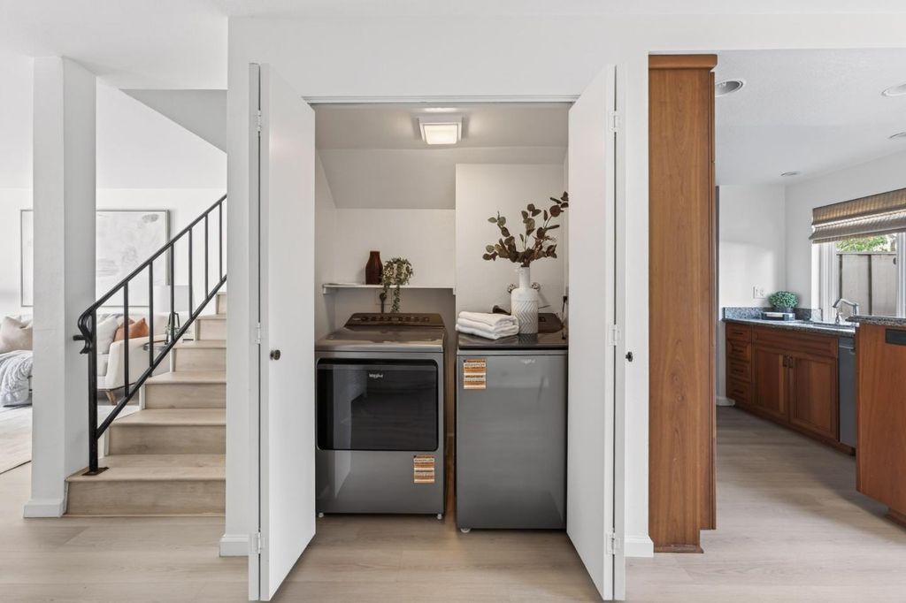 Discover comfortable living in the heart of Cupertino with this charming 2-bedroom, 2.5-bathroom home. This stunning 1,385 sf. home welcomes you with its sun-drenched living room. The kitchen is fully equipped modern amenities, including rich wood cabinetry, sleek granite countertops, a dishwasher, microwave, electric oven range, and refrigerator, all designed to make cooking and entertaining a breeze. The spacious dining room features built-in bookcases for added storage, perfect for gatherings. Upstairs, the expansive primary suite offers a peaceful retreat and large walk-in closet, while the secondary bedroom provides versatility with custom built-in bookshelves. The updated bathrooms feature clean lines and contemporary finishes with showers over tubs. Added convenience, the home offers a utility room laundry room with washer/dryer. Enjoy seamless outdoor living with a private brick-paved patio and a secondary wooden deck. This property is zoned for top-tier Cupertino School District. Community amenities include access to a pool, ideal for relaxation and recreation. With 2 garage spaces and plenty guest parking, this home is both functional and inviting, set in a vibrant city known for its tech-driven community and excellent location.